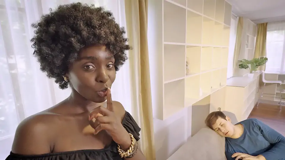 The holder of the apartment bangs an dark-hued hottie with bubble backside in doggy-style-fashion, while her tired bf sleeps on the sofa.