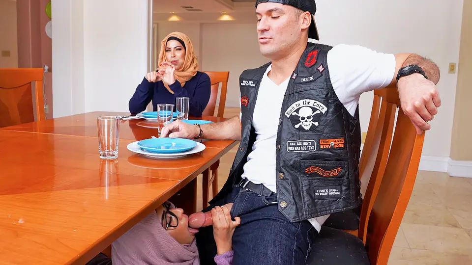 Hijab-wearing female providing a palm-job from under the table