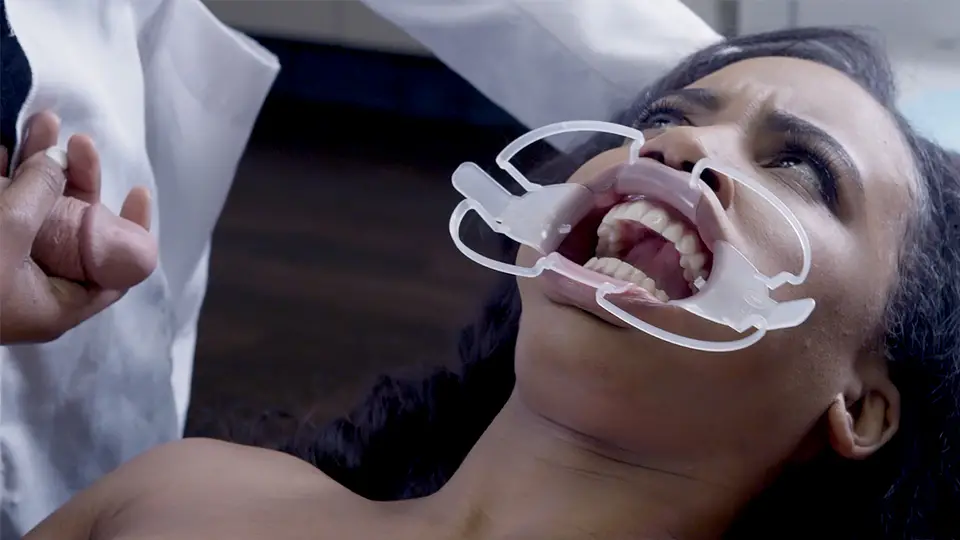 An dark-hued patient with a cheek retractor in the facehole is astonished by her doc as he bi-curious-racial humps her face with blow in the health center.